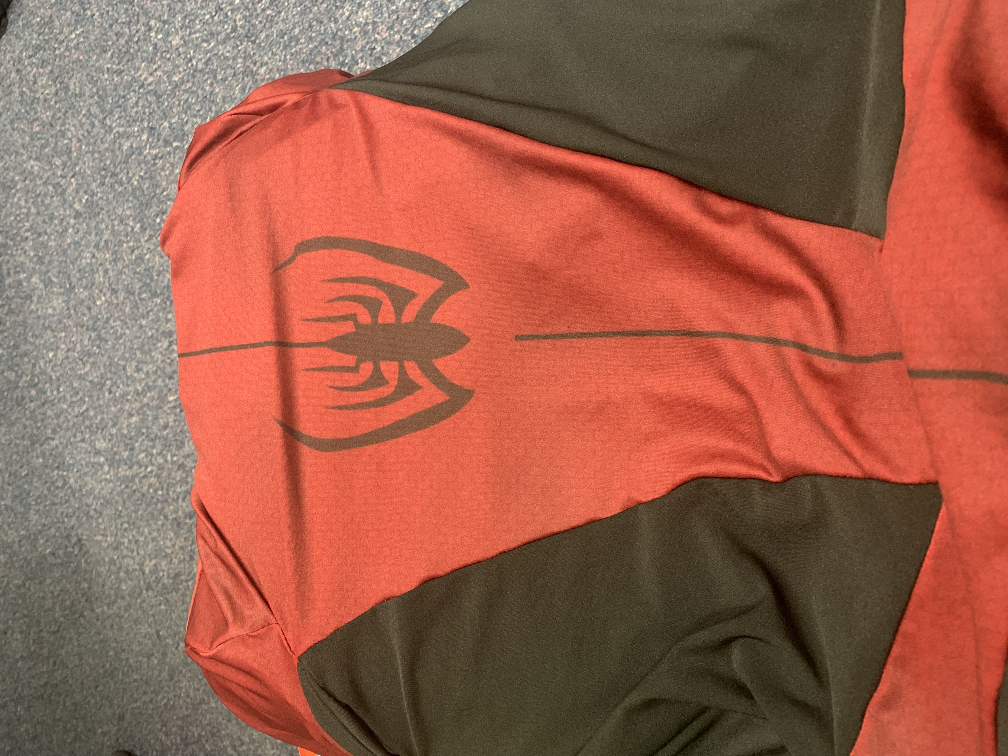 The whole suit is crazy high quality. The colored fabric is vibrant and stretches well, the screen print emblems look absolutely amazing and slightly stretches too, the zips are near invisible, and the shoes are comfy and fit perfectly. Will 100% be buying again!!