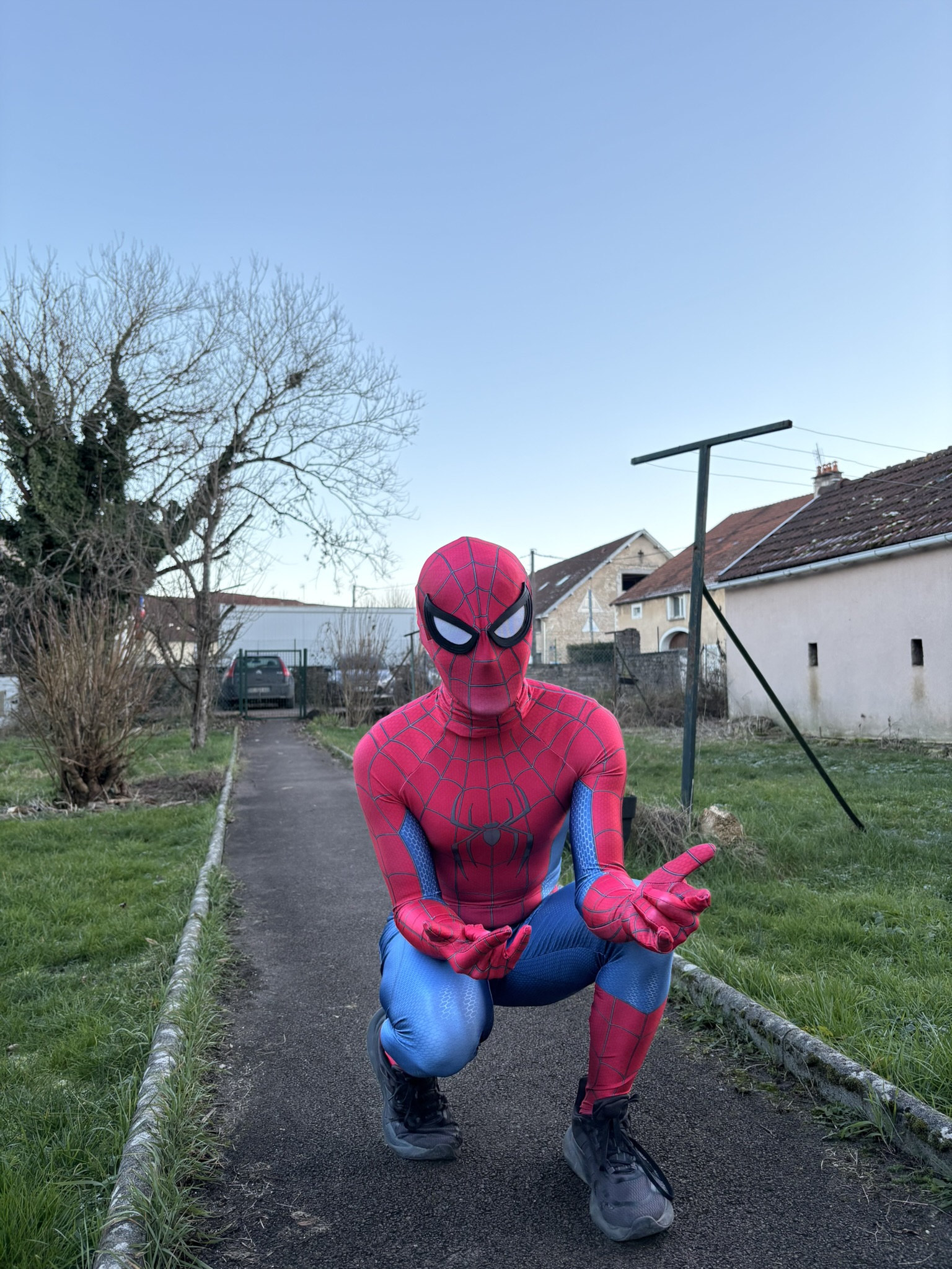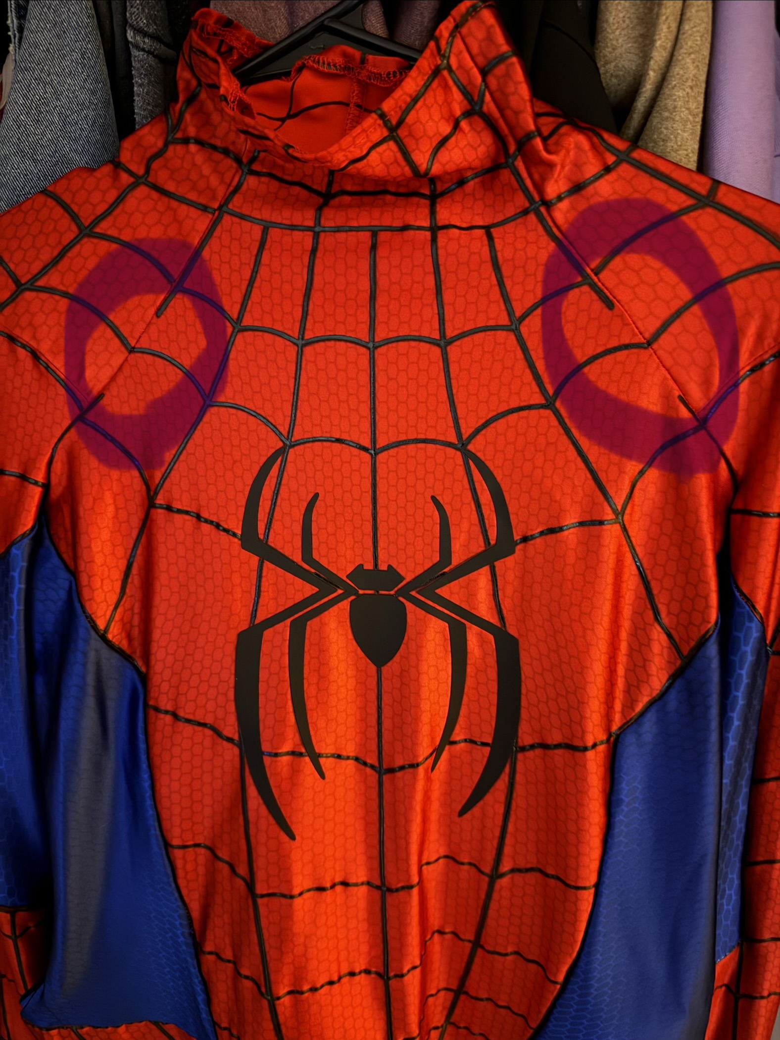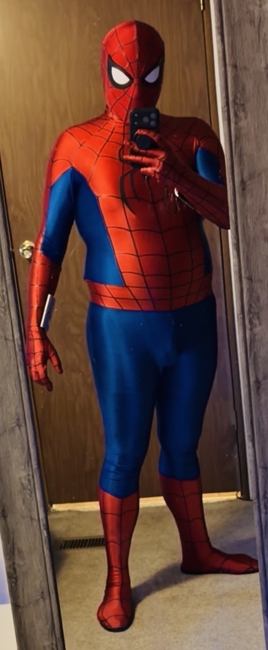 my mask was purchased separately but this costume is honestly near perfect. i don’t exactly model it the best being that i’m a bigger guy but regardless it’s made very well. my biggest complaint would be that the web design randomly has gapping as shown around the shoulder seams and i wish they would’ve just filled it in with the puff paint but i can likely fix it myself. over all though i’m very satisfied with this!